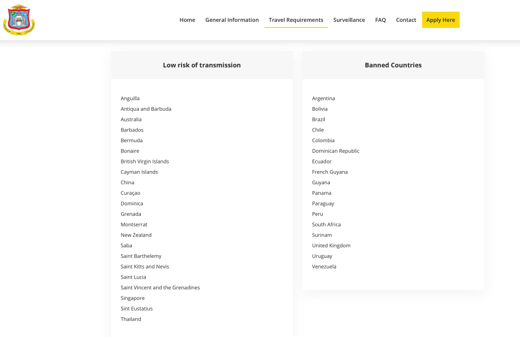 - Ab dem 27. Januar 2021 gilt bis auf weiteres ein Einreiseverbot für Personen, die sich in den letzten 14 Tagen in einem der in der nachstehenden Tabelle „Verbotene Länder“ genannten Länder aufgehalten haben. Einwohner von Sint Maarten/Sint Martin/Saba/St. Eustatius sind davon ausgenommen und können zurückkehren und sich bei der Ankunft gegen eine Gebühr von $125,00 testen lassen. Der EHAS-Antrag muss ausgefüllt werden.