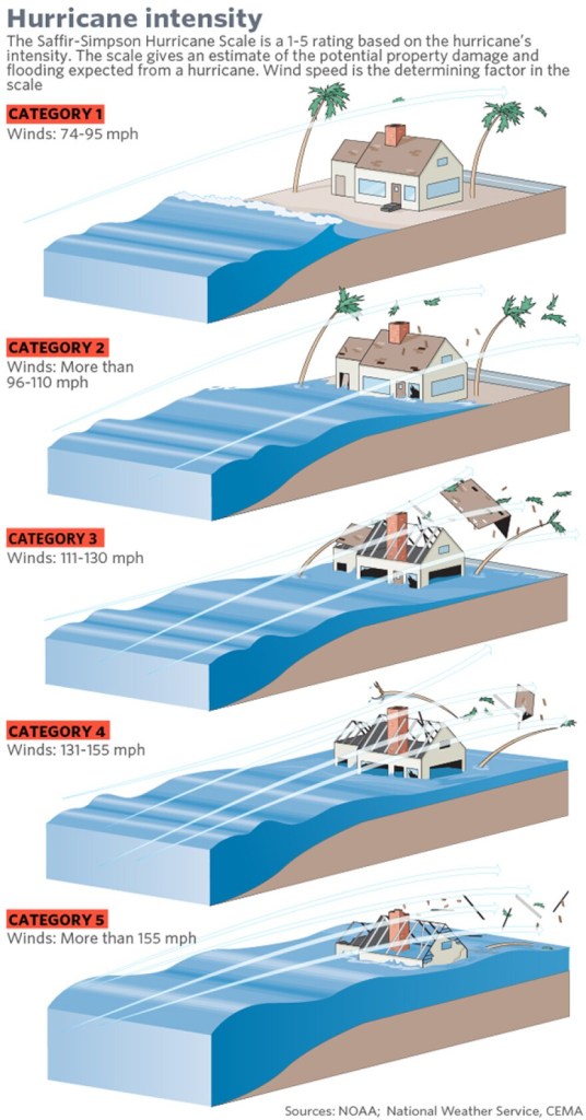 Hurrikane werden nach der Saffir-Simpson-Hurrikan-Windskala in fünf Kategorien eingeteilt, basierend auf ihren anhaltenden Windgeschwindigkeiten: