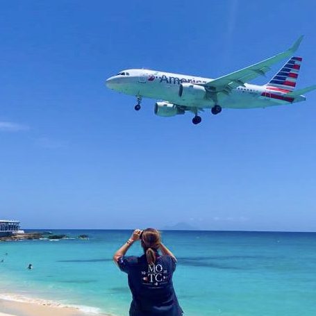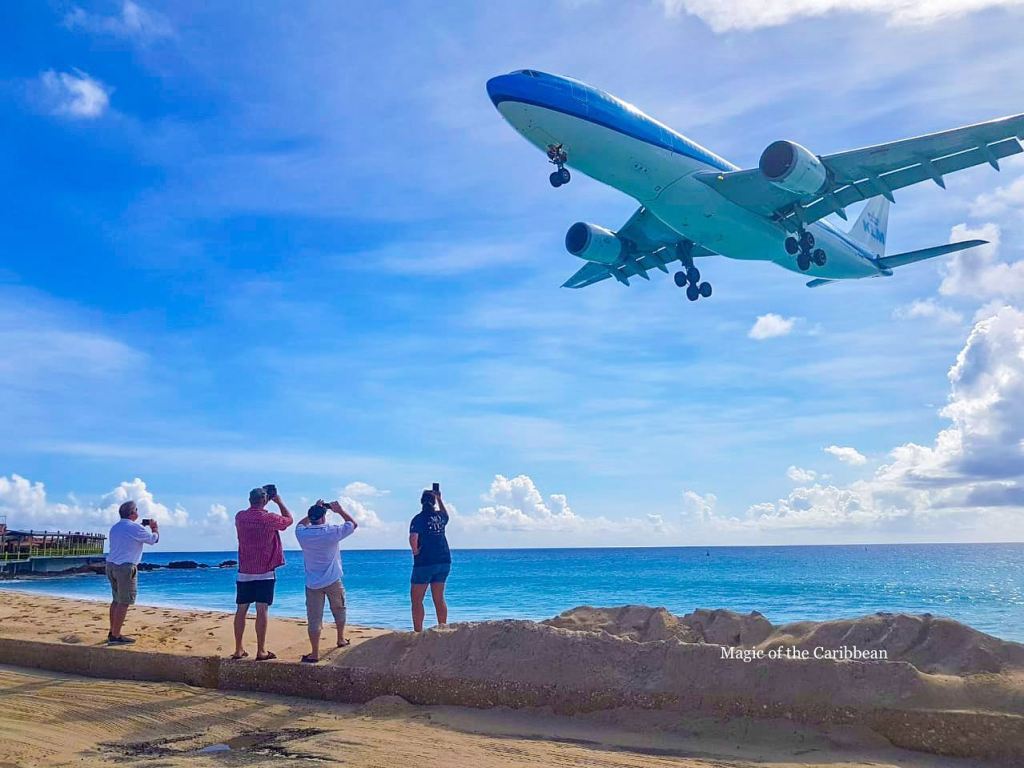 Nun geht es weiter über die Cause Way Bridge zum Maho Beach, um dort ca. 1 Stunde lang Flugzeuge beim Starten und Landen zu beobachten. Auch für weniger flugzeugbegeisterte Gäste ist es immer ein spannendes Erlebnis zu sehen, wie flach die Flieger über dem Strand und die Köpfe der Gäste auf dem internationalen Flughafen Princess Juliana International Airport fliegen. Wir beobachten aus sicherer Entfernung, wie Strandgäste und diejenigen, die sogar an den Zäunen hängen mit dem Jet Stream und dem aufgewirbelten Sand während des Starts zu kämpfen haben. (Achtung: der Aufenthalt direkt hinter einem startenden Flugzeug ist lebensgefährlich!)
